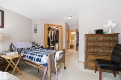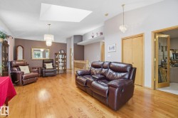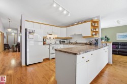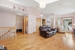 Located in Terra Losa East, an 18+ complex, this meticulously maintained original-owner home sits on the largest pie-shaped lot in the complex. Recent upgrades include a newer roof, maintenance-free front and back decks, plus a newer furnace & A/C. The dble attached garage is equipped with a wheelchair lift for added accessibility. Step into a bright, spacious layout featuring a front living room with gleaming hardwood floors & a gas fireplace. Just off the entrance is a versatile den/bedroom/flex space. At the rear of the home, the U-shaped kitchen offers a generous breakfast bar and flows into the adjoining dining area with sliding patio doors to the deck. A cozy family room tucked into the back corner features a second gas fireplace and overlooks the backyard. The spacious primary suite easily fits a king-size bedroom set and includes a 3-piece ensuite, while the main bath features a convenient step-in tub.The fully finished basement offers a massive rec room, lg bdrm, 3-pc bthrm & ample storage space.