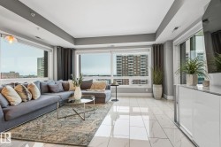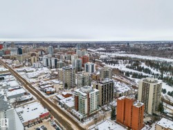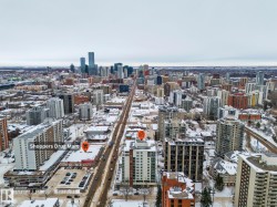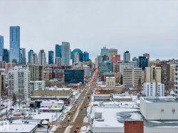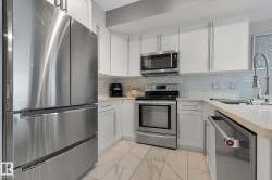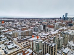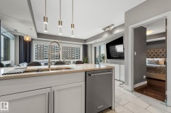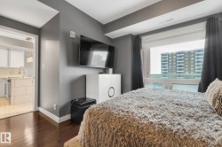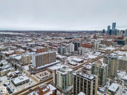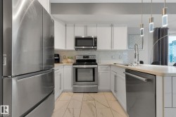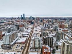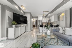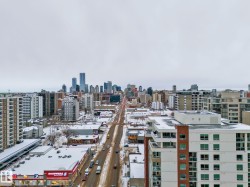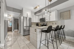 RENOVATED, MODERN condo on the 9 th floor w/ AMAZING VIEWS of Downtown North, East & West. A GENEROUS entryway welcomes you into a CHIC palette w/ 12x24 TILED floors, high profile trim, & UPDATED light & plumbing fixtures. Convenient in suite LAUNDRY room with UPGRADED front load washer/dryer. 2 bedrooms & 2 bathrooms, w/ HARDWOOD floors in each make for an ideal roommate or a work from home scenario. Cook in U-SHAPED, BRIGHT WHITE kitchen featuring STAINLESS appliances, QUARTZ countertops & custom tiled backsplash. The OPEN living room, has LARGE WINDOWS allowing NATURAL LIGHT to flood in. The living area opens onto the COVERED BALCONY w/ a NATURAL GAS hose bib, perfect for a evening BBQs and entertaining. RELAX in the Primary suite w/ a 3 piece ENSUITE w/ GLASS SHOWER. RARE! 2 side by side HEATED, UNDERGROUND parking stalls to keep your cars cozy! A quick LRT trip to the U of A! Located within WALKING distance to restaurants, shopping, parks and trails in the River Valley!