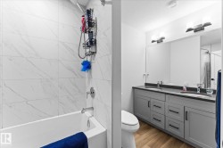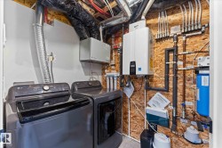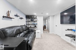 Almost BRAND NEW, this END UNIT townhouse in Waterford Court blends modern style with thoughtful upgrades. The bright main floor offers a contemporary kitchen with quartz counters, eating bar, sleek cabinetry, stainless steel appliances, and a spacious dining area. The open living room features custom built-ins—including a display cabinet and dog crate—along with a convenient 2-pc bath. Upstairs are 3 generous bedrooms and a 4-pc bath. The finished basement adds a family room, a large bedroom with its own 5-pc ensuite, and clever under-stair storage. Comfort upgrades include central A/C, hot water on demand, water softener and in-line filter, reverse osmosis system, and added insulation between flooring/walls. The heated, fully finished garage is currently a teen hangout with extra plugs and carpet, but can easily be converted back to parking. Backing onto greenspace, the deck is an oasis! Professionally managed, with landscaping and snow removal included in the condo fees. A rare opportunity!