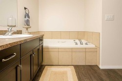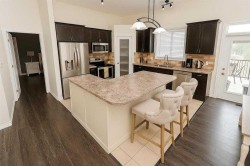 This beautiful, fully developed home breaks away from typical with a unique layout and offers something truly special—no rear neighbours, gorgeous curb appeal, and thoughtful details throughout. Inside, a grand entryway leads to a bright, open main floor featuring a stylish two-toned kitchen with a massive island, corner pantry, and central A/C. The dining and living area, complete with a cozy fireplace, is perfect for family time and entertaining. The primary suite is spacious with high ceilings, a walk-in closet, and a large ensuite with jetted tub and separate shower. Two more oversized bedrooms and a full bath are tucked just a few steps up—ideal for kids or guests. The walkout basement offers a large rec area, a huge fourth bedroom , a full bath, and a laundry/storage space. Enjoy a heated garage with epoxy flooring, a deck with gas BBQ hookup, two sheds, and a backyard built for making memories—complete with a gazebo and firepit. Backs onto walking trails and steps from schools, a basketball court, and a skating rink—this home is ready for your family. Book your showing today!