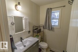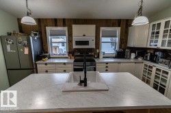 Located in the Village of Myrnam, this spacious family home offers a functional layout with numerous updates throughout. Vaulted ceilings highlight a two-sided, stone-faced wood-burning fireplace, creating a welcoming focal point between the main living spaces. The open floor plan connects the modern kitchen, living room, and dining area, providing a practical setting for everyday living and entertaining. The main floor features three bedrooms, including a primary bedroom with ensuite and access to a private deck overlooking the large, fenced backyard with open country views. The fully developed basement includes a fourth bedroom and a generous family and recreation room. An oversized single attached garage and newer siding contribute to the home’s attractive curb appeal. This well-appointed property offers comfortable living in a quiet small-town setting.
