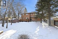 Homes like this are rarely available. Located in one of Red Deer’s most sought-after, tree-lined neighbourhoods, 4 Pardue Close offers a truly special setting with mature trees to the north, green space to the south, and a private lot exceeding 10,000 sq ft, further enhanced by additional trees for exceptional privacy. The home makes an immediate impression with its distinctive exterior and attractive rooflines and continues to impress inside with extensive recent renovations, including vinyl plank flooring, lighting, trim, paint, and more throughout. The spacious living room is filled with natural light from abundant south-facing windows and features a cozy wood-burning fireplace, while the adjacent dining room is also surrounded by windows, creating a bright and inviting space. The galley-style kitchen showcases stylish cabinetry, a pantry, two sinks, and upgraded stainless steel appliances, with a breakfast nook and sliding glass door overlooking the expansive private backyard. The main level is completed by the front entry and a convenient two-piece bathroom. Upstairs you’ll find the primary bedroom suite with a walk-in closet and three-piece ensuite, along with three additional bedrooms—one with access to attic storage—and a four-piece bathroom. A bright stairwell with a modern black metal railing and additional windows connects the levels. The lower level features new plush carpeting with soft underlay and includes a family room, an additional bedroom, a two-piece bathroom, and the laundry/utility room. The attached double garage offers space for two vehicles, and an extra-long front driveway provides additional parking. Outside, enjoy the updated oversized back deck and a large private backyard oasis complete with two sheds, a fire pit area, a dog run, vehicle access off of Piper drive, and plenty of space to relax or entertain. The sellers have enjoyed frequent sightings of deer, moose, and other wildlife from their windows. Additional updates include vinyl windows throughout most of the home, shingles replaced in 2015, a furnace updated in 2012, upgraded fencing with stylish metal panels, and more. Being just steps from some of Red Deer’s best treed walking trails and close to parks, a playground, a school, shopping, and amenities—4 Pardue Close is a rare combination of privacy and convenient location. (id:27)