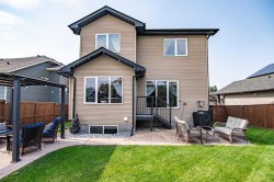 Pride of ownership in this upgraded, executive-built two storey home located on a quiet Close. The curb appeal is highlighted by a welcoming covered front veranda, with the front stairs rebuilt in 2023. Inside, the open-concept floor plan showcases a two-toned maple kitchen with crown moldings, full tile backsplash, a raised eating bar island, and a convenient walkthrough pantry. The appliances have been updated in recent years, complementing the timeless design. The dining area offers access to the deck with a BBQ gas line and the landscaped backyard with an irrigation sytem for easy watering, while the living room features a cozy gas fireplace and hardwood floors, main floor was recently painted as well (January 2025). The laundry has been relocated to the basement, but main floor hookups remain available in the mud room if desired. Upstairs, a spacious west-facing family room fills with natural light and captures incredible sunsets and gives mountain views on clear days. The king-sized primary suite offers a beautifully renovated 4-piece ensuite with double sinks and a tastefully designed oversized shower. Two additional bedrooms and a 4-piece bathroom complete the upper level. The basement is open for future development, already pre-plumbed for in-floor heating and a fourth bathroom, with space for additional bedrooms and a finished flex/gamers paradise room. Recent updates include fresh paint throughout (including ceilings), upgraded carpet with premium underlay, and replacement of all upstairs windows (around 2020–21). Major maintenance items have also been addressed with new shingles (2024) and a new hot water tank (2024), ensuring peace of mind for years to come. The exterior is equally impressive, featuring curbed landscaping, a concrete patio, and a repainted fence (2021), all contributing to a finished and well-cared-for outdoor space. Completing the property is an oversized 24X26 heated garage with in floor drains. A well cared for property ready for new owners!