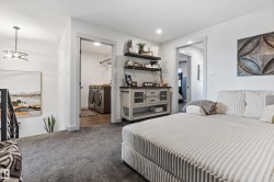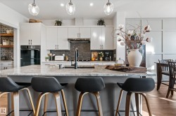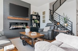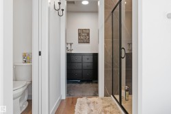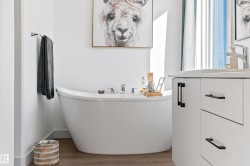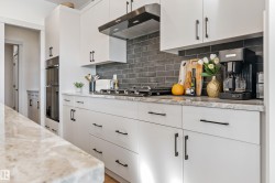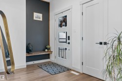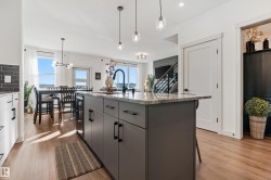 Backing onto the lake and facing the park, this exceptional 2-storey home features a modern farmhouse design with 2,159 sq. ft. plus a partially finished walkout basement. The main floor offers a stunning kitchen with high-end appliances, quartz countertops, walk-through pantry, and spacious dining area. Additional features include vinyl plank flooring, flex room/office, powder room, and bright living room with electric fireplace. Upstairs offers a bonus room, new carpet (to be installed), 3 bedrooms, 4-piece bath, and laundry room with sink. The primary suite includes a luxurious 5-piece ensuite and walk-in closet. The walkout basement is framed for a future bedroom, bathroom, wet bar, and fireplace. Enjoy beautiful sunrise views from the large deck. Fully fenced and landscaped yard with dog run and $20K custom shed. Oversized (23’x26’) heated garage with custom shelving, cabinetry, and 8-ft door. A perfect blend of luxury, location, and lifestyle.