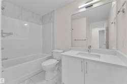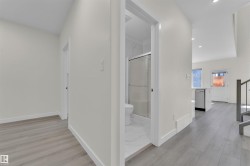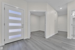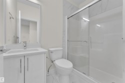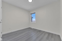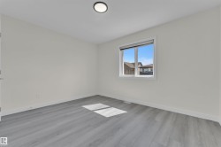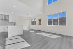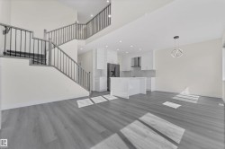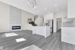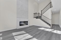 Detached front double car garage home on a regular lot in Fenwyck, backing onto a walking trail. This open-concept layout features a main floor bedroom with closet and full bath, a modern kitchen with quartz countertops and center island, plus a separate spice kitchen. The living room boasts open-to-below ceilings, an electric fireplace, and tile feature wall. Dining nook opens to the backyard. Vinyl flooring throughout main and upper floors, with elegant spindle railings. Upstairs includes a bonus room, laundry, and three bedrooms—primary with ensuite, walk-in closet, and indent ceiling. Basement has separate side entrance and two windows. Includes all appliances and blinds on main and upper floors. Fenwyck is one of the most sought-after communities, surrounded by 80 acres of preserved forest, offering peaceful natural living near city convenience. Just 11 minutes from Edmonton with direct access to Hwy 16A via Pioneer Road—ideal for first-time buyers or families seeking their forever home.