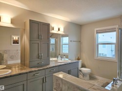 Discover the bright, beachy charm of Jensen Lakes! This stunning 2-storey family home offers over 2,375 sq.ft. plus a fully finished basement. The open-concept main floor features a modern kitchen with stainless steel appliances, granite countertops, a walk-thru pantry, oversized island, and wet bar. The great room with fireplace accent wall flows into a spacious dining area—perfect for entertaining. Upstairs offers 4 bedrooms, a bonus room, laundry, and a primary suite with walk-in closet, fireplace, and a spa-like 5-piece ensuite. The basement includes a large family room, 5th bedroom and full bath. Enjoy the TRIPLE TANDEM garage, central A/C, permanent exterior LED lighting, and landscaped yard with a large deck. Walk to two new schools, parks, playgrounds, and enjoy exclusive access to the private Jensen Lakes beach!