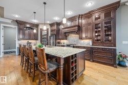 Experience unmatched luxury in this executive custom-built walkout bungalow in Kingswood. With over 4,440 sq ft of living space, this home offers 10 ft ceilings, travertine tile, scraped hardwood, coffered detailing and a full stone fireplace that anchors the main living area. The chef’s kitchen features JennAir appliances, granite counters, a huge island, custom cabinetry, walk-through pantry that leads to an oversized mudroom with custom lockers and den on the main. The private primary suite includes a large walk-in closet and a spa-inspired ensuite with heated floors, dual sinks, jetted tub and a walk-in double steam shower. The walkout basement is built for entertaining with heated floors, wet bar, 4 large bedrooms, two full baths, a spacious laundry room and a temperature-controlled walk-in wine cellar. Outside, enjoy a low maintenance landscaped yard with privacy trees, stone patio, composite deck. A heated oversized garage with a lift accommodates 3 indoor stalls. An exceptional Kingswood home.