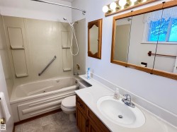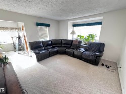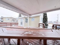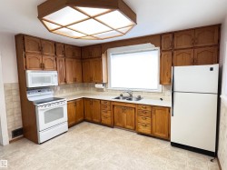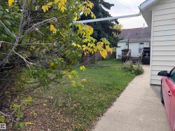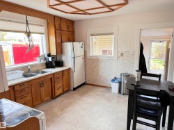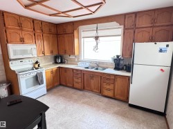 Tidy and full of character is this 900 sq.ft. bungalow in the fabulous Southview area of Westlock. Oak kitchen cabinets with sunshine box light & built-in microwave. Bright living room is right-sized & has a garden window. 2+2 bedrooms. Bright front den. Main floor laundry at rear entrance. Full bathroom is attractively appointed & has a jet-soaker tub. Basement features a 3-piece bathroom, rumpus room, 2 bedrooms & storage. Massive 26x24 heated, lined, 12' high wall, 10' high doors garage with carport on the front of it. Overhead doors on front and rear of garage (drive right through). Covered deck is large and will be repaired to ensure the next summer BBQ is enjoyable. Super-sized driveway in front, plus double parkpad at rear. 2 blocks to downtown core. 2 blocks to Westlock Rotary Spirit Centre (multi-plex sports facility). Close to schools, playground & grocery store. 2012 Hot Water Tank, Newer HE furnace.