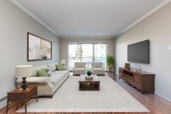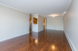 Fernwood Manor is a 55+ complex that has had several updates including the elevator, hallway carpeting & hot water tank. It also provides 2 guest suites, a workshop, exercise room & library. This 1011 sq ft well cared for unit offers 2 beds & 1 bath. The unit is on the first floor but is not ground level. It has been freshly painted throughout, including doors, mouldings & ceilings & features some new light fixtures plus new plugs & outlet covers. The kitchen has S/S appliances, generous cabinetry & plenty of counter space for all cooking needs. The main living area is bright thanks to the balcony & sliding doors. In-suite laundry adds everyday convenience. A big storage locker in the parking garage sits beside the assigned parking stall. The strata fee includes heat, hot water & hydro.