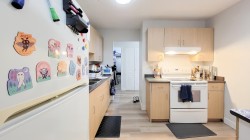 Beautifully renovated and move-in ready! This spacious 2-bedroom, 1-bath condo offers a stylish modern interior and peaceful greenbelt views from the large, private deck. Enjoy the benefits of a fully updated building with a complete envelope retrofit in 2021 — including new windows, siding, balconies, and railings for long-term peace of mind. Inside, the home features new laminate flooring, fresh paint, updated lighting, and a separate laundry room. Heat and hot water are included in the maintenance fee. Comes with 2 parking stalls and 1 storage locker. Pet- and rental-friendly (with restrictions). Perfect for both homeowners and investors! Centrally located near Mill Lake, the hospital, shopping, recreation, and schools.