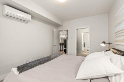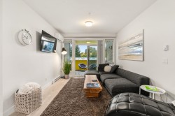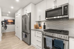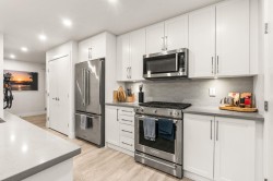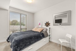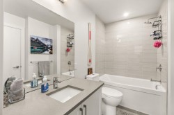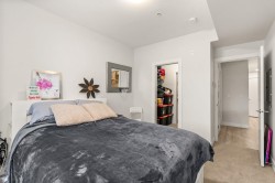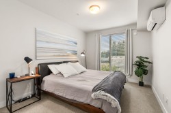 Welcome to Mill District, where modern living meets unbeatable convenience. This bright and stylish 2-bedroom 2-bathroom home is ideally situated in one of Abbotsford’s most central locations, just steps away from Mill Lake Park and surrounded by mountain views. Inside enjoy high ceilings, granite countertops, premium KitchenAid appliances with a gas range, and a spacious kitchen complete with large pantry. The home features laminate flooring, a side-by-side washer and dryer and air conditioning for year-round comfort. Both bedrooms include a walk-in closet and private, ensuite bathrooms, with the primary offering a double vanity and glass door, a rain shower. Step outside to a large west-facing patio with an unobstructed view and a gas BBQ hookup perfect for relaxing in the evenings!