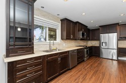 HERE IT IS! A split-entry home on a nearly 10,000 sqft flat lot in a quiet neighborhood. Open-concept layout featuring a large kitchen with stainless steel appliances, plenty of counter and cupboard space, and a dining area with access to a huge covered sundeck. Two gas fireplaces. Three bedrooms upstairs and two downstairs. Basement has a separate entrance and is easy to convert into a suite. Newer windows, blinds, and built-in cabinets. Enjoy the fully fenced backyard with a gazebo, hot-tub wiring, and a storage shed. Double car pull-through garage.