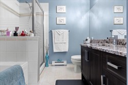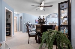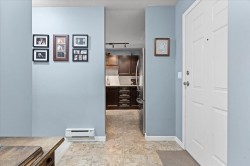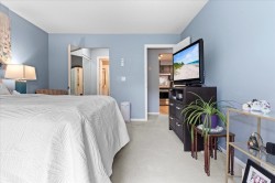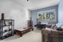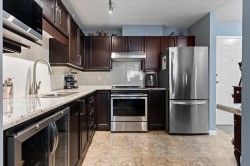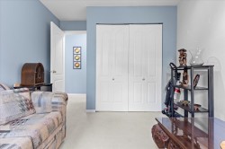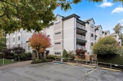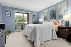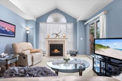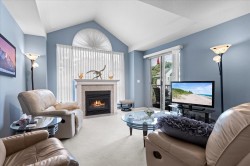 Top floor, west-facing 2 Bed + Den Condo in Bramblewoods by the Stream! Updated and move-in ready, this bright and spacious unit features a custom maple kitchen with granite countertops, stainless steel appliances and vaulted ceilings in the open-concept living area. Enjoy a natural gas fireplace (gas incl. in strata fee!) and covered deck perfect for year-round use. Primary bedroom has balcony access and a beautifully updated ensuite with separate tub/shower. Second bath also fully updated. Bonus den, oversized laundry/storage room and a storage locker in the underground area. Quiet 55+ building with a small pet allowed. Prime central location on a cul-de-sac—steps to Horn Creek Nature Path, Mill Lake and shopping. This condo offers downtown convenience without the noise!