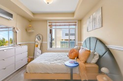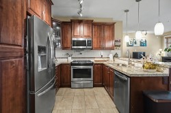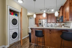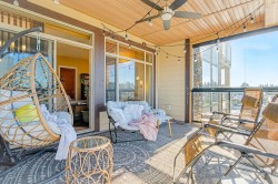 Step into this bright 4th-floor end unit at La Galleria and experience the perfect blend of comfort and style. This 2-bedroom home features a versatile second room for a guest suite, home office, or flex space, plus 749 sq ft of living space and a 219 sq ft enclosed solarium with retractable glass, ceiling fan, and BBQ—ideal for year-round enjoyment. The modern kitchen with quartz counters and gas range complements the cozy fireplace. Includes in-suite laundry, 2 parking stalls, storage, gym access, and a pet-friendly location steps from shops, cafés, restaurants, and the library. Move-in ready and beautifully maintained.