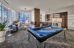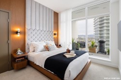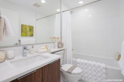 This bright, move-in-ready 1 bed + den home showcases unobstructed water views toward New West Quay and Mount Baker. A functional layout features a corner living area with floor-to-ceiling windows and a convenient cheater ensuite. The kitchen offers full-size appliances, including a gas cooktop and front-loading washer and dryer. The spacious den is ideal for a computer area, home office or extra storage. Comfort is ensured with an energy-efficient heating and cooling system and in-building concierge. Residents enjoy access curated amenities that include a fitness centre, guest suite and social lounge. Move in today!