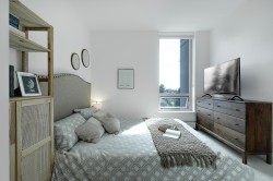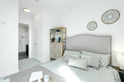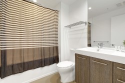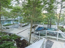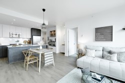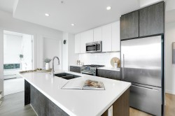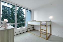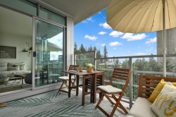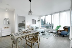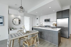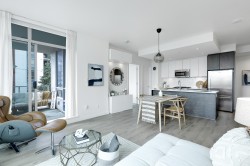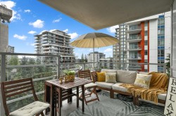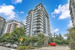 ALTITUDE- SFU's master-planned University District. This bright 3 Bed + 2 Bath + Work station , Southwest CORNER unit has stunning Panoramic Mountain and city Views. NEW laminate flooring (July,2025) in livingroom and kitchen, 9 Ft. ceilings & floor-to-ceiling windows that fill the space with natural light. The two bedrooms are thoughtfully separated by the living/dining area, providing privacy & tranquility, very generous sized. Ample visitor parkings & EV chargers available. Just one block from SFU campus, bus loop, daycare, supermarket, & cafes. Strata fee includes heat , gas and hot water.