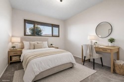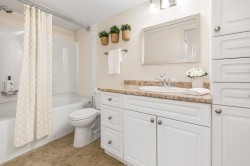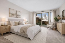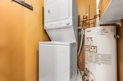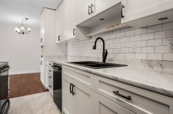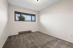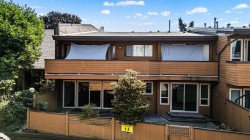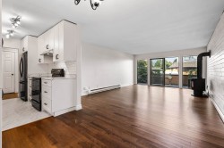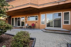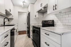 STUNNING RENOVATED 2 BEDROOM and 2 BATHROOM GROUND LEVEL with private entry. Enjoy those morning coffees and afternoon beverages with mountain views in your PRIVATE 400 SQ FT FENCED YARD/PATIO- amazing for pets and entertaining. Step inside to MODERN LIVING w/ a beautiful kitchen featuring NEWER SOFT CLOSE WHITE SHAKER CABINETS, sleek black appliances, and tiled backsplash. Lovely hardwood flooring, fresh paint, UPDATED GAS FIREPLACE for efficient heat, and IN SUITE LAUNDRY. 2 large bdrms including the primary suite w/ 2 pc ensuite and easy access to the patio! Covered parking for 1 vehicle, large storage locker in carport, & plenty of additional guest parking. TWO pets allowed, 22' at the shoulder. This incredible home is VACANT and ready for occupancy. Nothing to do but MOVE ON IN!