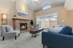 Spacious and well-maintained home in a desirable 55+ community, offering comfort, functionality, and charm. An oversized dining room flows into a bright living room with vaulted ceilings and a cozy gas fireplace—perfect for hosting or relaxing. The massive master bedroom features a large ensuite and a walk-in closet. A versatile second bedroom is ideal as a guest room, home office, or hobby space. The lower level includes a generous rec room with a free-standing fireplace, two partially finished storage rooms, and a large additional bedroom with its own walk-in closet. Step outside to enjoy a two-tiered backyard with a large patio and convenient sidewalk access to the front. BONUS FEATURES include new carpets on main floor, double garage, air conditioning, and a built-in vacuum system.