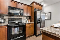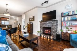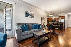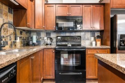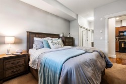 Welcome to The Regent! This bright and spacious second-floor unit offers 2 BEDROOMS, 2 BATHROOMS, PLUS A DEN— perfect for a home office! The open-concept layout features high ceilings, a kitchen with granite countertops, ample cabinetry, & an island with seating, flowing seamlessly into the dining area & living room with a COZY ELECTRIC FIREPLACE & access to the patio. THE PRIMARY BEDROOM INCLUDES AN ENSUITE WITH DOUBLE SINKS. Enjoy the convenience of IN-SUITE LAUNDRY with storage space & shelving, AIR CONDITIONING for year-round comfort, & a COVERED BALCONY WITH BEAUTIFUL MOUNTAIN VIEWS. This PET-FRIENDLY BUILDING includes one UNDERGROUND PARKING STALL & is ideally located within WALKING DISTANCE TO THE RECREATION CENTRE, PARKS, SHOPPING, DINING, & MORE! Don't miss this great opportunity!