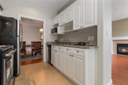 This bright, spacious corner unit is waiting for it's new owner. This 2 bedroom 2 bath unit has 9' ceilings, natural gas fireplace, hot water heating and in suite laundry. Gas, heat and hot water are included in your strata fee. Secure parking under the building with storage and car wash area and a workshop. This 2nd floor has a small shared storage area also. A bright amenities room with a kitchen is perfect for gatherings. There is also an inbuilding post office including pick up and parcel delivery. This is a 55+, no pets, no smoking building located in a prime downtown area. Unit is vacant so quick possession is available.