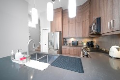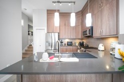 Prestigious townhouse complex located in a quiet cul-de-sac, surrounded by unparalleled natural beauty. This beautiful northeast end-unit townhouse, originally a show home, features 10-ft+ ceilings on the main floor, laminate flooring, and a spacious living and dining area. The modern kitchen is equipped with stainless steel appliances, quartz countertops, and ample storage. The luxurious primary bedroom offers a great south view. Below, with a separate entrance, includes a cozy bedroom, a generously sized den, and additional flexible space that can be used as an extra bedroom, office, or recreation room—your choice. Perfect for a growing family or downsizers. You will love it when you see it.