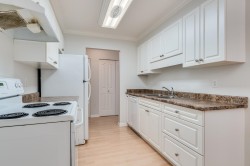 Updated, 992SF 2-bdrm condo UNDER 500K, steps to Coq Ctr, Browns, Douglas College, Skytrain, West Coast Express, loads of shops & restaurants. Very spacious plan w/2 large bdrms, primary w/cheater ensuite & w-i closet. Updated kitch w/newer cabinets, counters & appliances. Formal dining rm off kitch open to huge living area w/slider to ultra private, super quiet, covered deck overlooking walking/bike trail along Greenbelt & Hoy Creek. Updated doors, laminate floors, base & crown moulding. INCL 2 SIDE-BY-SIDE PARKING, large insuite storage, building completely Rainscreened for peace of mind. Quick possession possible. Build big equity, very smart investment, property potentially future Highrise site. *Some images are virtually staged.
