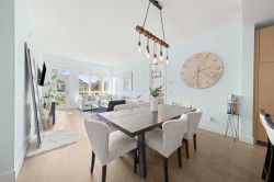 Discover unparalleled luxury in Ladner's premier waterfront enclave,Pilot House.This 2 bed/2 bath 1193 sq ft floorplan is an entertainer's dream,showcasing a stunning kitchen,soaring ceilings & an abundance of southern light that fills the space daily.The chef-inspired open kitchen anchors the home,featuring pro-grade SS appl,premium cab& oversized island that flows seamlessly into expansive living & dining spaces finished w/ luxury hw flooring. Bdrms are thoughtfully placed at opp. ends,each a generous retreat w/WIC. Primary bath w/ soaker tub, double sink+ shower. Modern comforts incl A/C, in-suite ldry, storage & sec prkg. Resort-style amens elevate daily life: outdoor pool, hot tub, elegant lounge, guest ste & sport crt. Steps to scenic trails, Captain's Cove Marina, dining & schools.