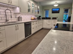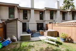 LAUREL COURT- This beautifully updated, 3 bdrm, 3 bath, 1650 sq ft. t/h has an ideal layout w/ main floor living (incl a powder room) & upper level w/ spacious primary bdrm, 2 additional bdrms, a skylighted open flex area suitable for home office or play area, 2 full bathrooms, easy attic storage access, & Romeo & Juliet balcony off 3rd bdrm. Spacious living room features a cozy gas fireplace & patio doors opening up to a large patio & yard w/ storage shed backing onto park-like common space. Highlights include modern kitchen w/ quartz countertops & SS appliances, new pantry/laundry room, radiant heated flooring in kitchen, bathrooms & primary bedroom; updated flooring throughout, surround sound ceiling speakers in LR, high efficiency multi zone heat pump/AC, & tons of functional storage.