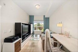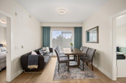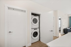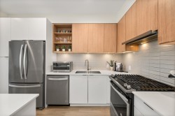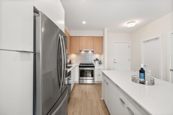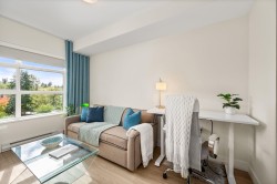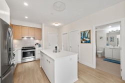 Top-floor 2-bed+den home with soaring 11’ vaulted ceilings & bright southern exposure—flooded with natural light! Beautifully kept & owner-occupied, this inviting suite offers an open-concept layout with modern kitchen, S/S appliances & spacious living area leading to a sunny balcony for relaxing or entertaining (gas outlet). The primary bdrm features a walk-in closet & full ensuite, while the den makes an ideal home office or flex space. Enjoy peace of mind with no one above you. Secure underground parking, fitness centre, lounge & BBQ area. Fantastic location in the Seaquam Sec (IB Program) catchment—steps to shops, dining, schools, trails & transit. Rentals & pets allowed.