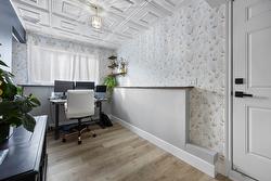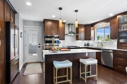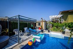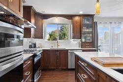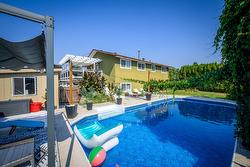 Tucked away on a quiet cul-de-sac, this beautifully updated 4 bedroom plus den and office basement-entry home offers the perfect blend of comfort, style, and functionality. The heart of the home is a stunning kitchen featuring a large island with eat-at bar and 2nd sink, stone countertops, custom paneled fridge, tiled backsplash, gas range, plus 2nd built in oven and convection microwave. Off the kitchen is access to a large deck with pergola - perfect for entertaining! Flowing seamlessly from the kitchen is the dining area with 2nd access to the deck and leads to the bright living room complete with built-in cabinetry and a real wood fireplace for cozy winter evenings. Upstairs you'll find two spacious bedrooms, a versatile den, and a sleek 4-piece modern bathroom. The basement adds even more flexibility with a 2 bedrooms, office, 3-piece bathroom, generous rec room, and a well-equipped laundry room with utility sink and storage. Step outside to your private oasis: a heated inground pool, lush greenery, a grassy area for play, and a handy shed. With ample parking and close proximity to all amenities, this home checks every box for comfortable family living and year-round enjoyment. All meas approx