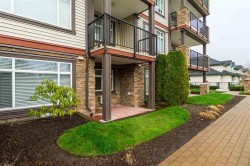 Quick possession possible! Welcome to Madison Crossing by Quadra Homes! This beautiful 1 bedroom + Den ground floor unit has bright southern exposure with lots of windows and your own private entrance! Open concept kitchen with cherry cabinets, stainless steel appliances, granite countertops & a large island. Perfect for entertaining! Master bedroom with ensuite. Use the den as an office or 2nd room! Large outdoor patio, great for those with kids or pets! In-wall air conditioning included. Located on a quiet street and near Willowbrook Mall, schools (Nicomekl Elementary & Global Montessori), transit, near future Skytrain Station, restaurants and parks. Rentals allowed, no restrict/. Perfect for first time buyers or investors!