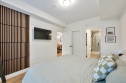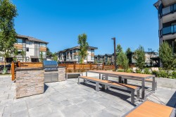 Bright, open, southwest-facing 2-bed, 2-bath corner home with a highly sought-after ground-level walkout patio, built by award-winning Zenterra. Excellent floor plan with 9 ft ceilings and vinyl plank flooring throughout. The kitchen features shaker-style cabinetry with a pantry, Samsung stainless-steel appliances with a gas range, a large island, quartz countertops, and an undermount sink. Two spacious bedrooms plus a bonus linen/storage area. Gas hookup on the patio. Unbeatable location: walk to coffee shops, restaurants, fitness facilities, and the Langley Events Centre. Future rapid transit will connect this area directly to SkyTrain. One underground parking, with more available to rent/purchase, plus plenty of street parking right out front.