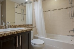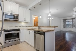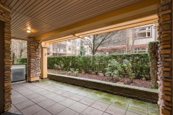 2 BED | 2 BATH | LARGE FLEX/DEN | PRIVATE PATIO. Bright & beautifully designed OPEN CONCEPT home that is functional, well laid out & exceptionally built. Bedrooms are positioned on opposite sides for added privacy, each with walk-through closets and ensuites featuring heated floors. Versatile DEN/FLEX room with closet works as a home office or potential 3rd bedroom. Updated white kitchen with quartz counters, 5-burner stove, walk-in pantry & BRAND NEW fridge with ice & water. Large private patio for year-round use. AIR CONDITIONING & high-efficiency heat pump. Updated carpets in both bedrooms. Vacant & move-in ready. 2 parking stalls plus secure garage-style storage with power. Excellent location close to shops, restaurants, schools, trails & HWY 1. Strata fee incl gas, hot water & gym.