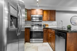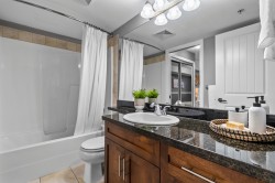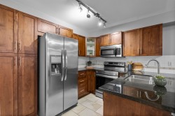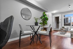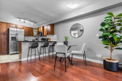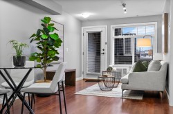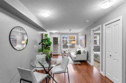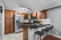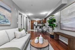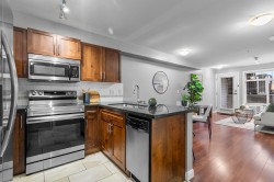 Immaculate one-bedroom ground floor condo is a must see. Bright, open layout features granite countertops, stainless steel appliances, and a semi-ensuite bathroom. New carpet in bedroom and den/storage space, fresh paint throughout, and updated light fixtures create a modern, welcoming space. Perfectly positioned ground-floor unit in a well-maintained building with stunning courtyard. Prime location just 100m from transit, steps to shopping, dining, recreation, casino, and town center. Flexible for investors and pet lovers - rentals permitted, pets allowed with restrictions. This spotless home is ready for even the most discerning buyer. Book your showing today!