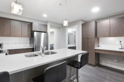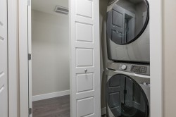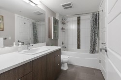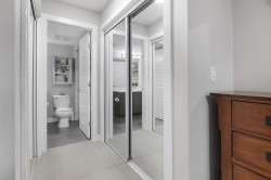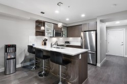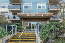 Well laid out 1 bedroom plus den and 2 bath home at Bearing Pointe facing the quiet side, featuring an oversized den with a closet that easily functions as a second bedroom, primary bedroom can accommodate king size furniture. The kitchen is bright and modern with stainless steel appliances, quartz countertops, sleek cabinetry, under cabinet lighting, a built in pantry and computer nook, plus a breakfast bar. Enjoy a cozy living area with fireplace that opens to a large covered deck surrounded by greenery for year round enjoyment. Additional highlights include updated lighting, a convenient powder room, and full size in suite laundry. Prime location close to shopping, transit, and parks. 1 parking and 2 pets allowed.