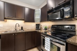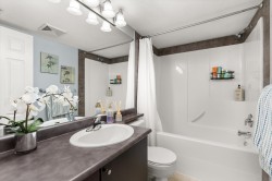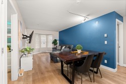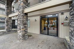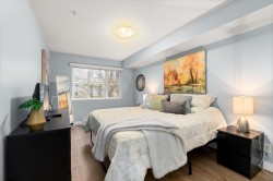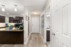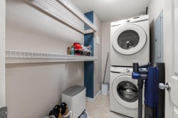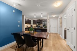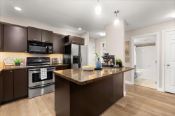Welcome to Brydon Walk! This spacious 2 bed, 2 bath condo offers nearly 900 sq ft of bright, open-concept living in a quiet, private location on the courtyard side of the building. Enjoy vinyl plank flooring throughout, a functional kitchen with large central island, granite countertops, sit-up bar, and stainless steel appliances—perfect for everyday living and entertaining. The oversized primary bedroom easily fits a king-size bed and features a walk-in closet and ensuite. Rare dedicated laundry room with built-in shelving and upgraded Samsung washer/dryer provides abundant storage. One secured parking stall and lots of visitor parking. Professionally managed building with a new roof. Steps to Brydon Park, lagoon, trails, shopping, and the future SkyTrain. Book your private tour today!