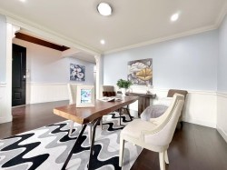 Luxurious home in Yorkson South! Featuring a gourmet kitchen with granite counters, large island with built-in drawers, custom maple cabinets, S/S appliances & gas stove. Main floor offers a spacious office/living space with wainscoting, plus a bright family room with gas fireplace, custom built-ins & engineered hardwood floors. Upstairs includes a primary suite with walk-in closet & organizers, ensuite with jacuzzi tub, granite counters, maple cabinets, separate showers & mountain views. Radiant heat, designer lighting & crown mouldings throughout the top two floors. Basement includes media room & 2-bed legal suite with new laminate flooring. Close to Lynn Fripps Elementary, parks & shopping.