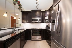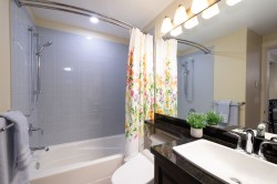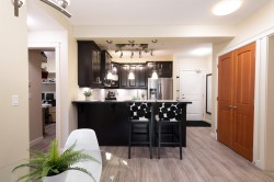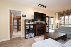 YORKSON CREEK - Quality-built by Quadra Homes. Quiet inside unit with an open view overlooking the court yard. Large 2BR + Den, plus 181/sf enclosed solarium = total of 1,295sf living space. Extremely clean and well maintained by owner. 9ft high-ceiling, full Air-conditioning and new laminate flooring in living & dining area. Kitchen comes with solid shaker cabinets, granite counter tops, and s/s appliances. Ideal floor plan for small family : 2 separated bedrooms with 5pc master ensuite, and cheater-ensuite for 2nd bedroom. Large Den can be used as 3rd bedroom, or home office. 2 parking + 1 private storage. 2 pets allowed. Close to schools, Yorkson sports complex and shopping, and easy access to HWY 1.