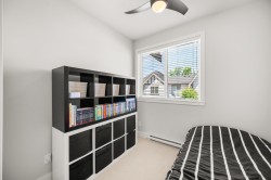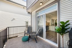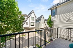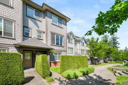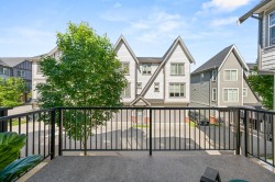 EVERLY GREEN – The best unit in the complex! This bright, end-unit townhome boasts the highest rooftop with stunning mountain and forest views. One of only three units with 3 parking spots—garage, carport & driveway. The private rooftop patio is a true oasis: sunny all day and perfect for sunbathing, dining, BBQs (gas hookup), relaxing by the fire, or adding a canopy for year-round use. Enjoy a second patio off the kitchen and a sunny front yard with new grass. Surrounded on 3 sides by protected greenbelt, with a playground at your doorstep and Yorkson Park just steps away. Walk to schools, close to HWY 1 & Carvolth. Bonus den, epoxy garage floors, gas range—this one has it all!