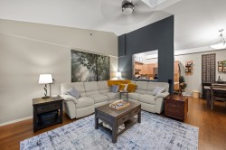 Welcome to Westside Estates - This updated and spacious top-floor 2 bed, 2 bath home offers 1,081sqft. of living with up to 12' vaulted ceilings, oversized windows, and a peek-a-boo mountain view. The bright living room includes a cozy fireplace, and the kitchen comes with updated appliances and plenty of counter space perfect for everyday living and entertaining. The generous primary bedroom easily accommodates a king size bed, features a walk-through closet leading to a private ensuite. Situated on the quiet side of the building, the unit includes two parking stalls and a same floor storage room for ultimate convenience. Located just steps from restaurants, local breweries, Willowbrook Shopping Mall, and the future SkyTrain, this home combines comfort, space, and an unbeatable location!