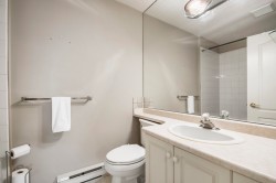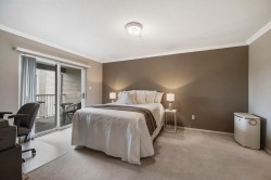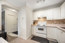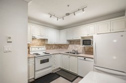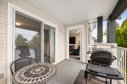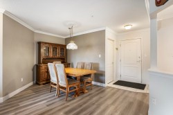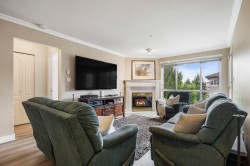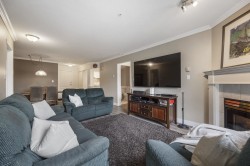 Welcome to Monterey Grande! This rarely available TOP FLOOR 2-bed, 2-bath condo offers 1,030 sq ft of spacious living in a QUIET location. You will be greeted with an open floor plan featuring UPDATED laminate flooring & crown moldings with a large dining area open to the living room featuring a cozy gas fireplace! The oversized primary bedroom boasts double closets w/ensuite + generous second bedroom, family bathroom & laundry room with SXS washer & dryer! Enjoy your morning coffee with mountain views on your large covered deck! BONUS storage locker conveniently located right beside your unit + 1 underground secure parking spot! The well-managed building features an amenity room, bike storage & workshop. Located - close to shopping, restaurants, an off-leash dog park & future Skytrain!