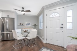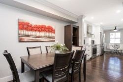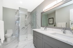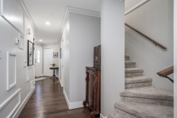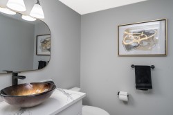 Absolutely beautifully updated from top to bottom! Rich hardwood floors flow throughout the main level, complementing a timeless white kitchen loaded with quartz counters and new quality appliances. The living room features a newer gas f/place with surround and hearth, plus sliders to a private backyard and newly poured patio—perfect for entertaining. A powder room and laundry/storage with new washer and dryer complete the main floor. Upstairs, the spacious primary bedroom offers an updated ensuite and private sundeck, along with new carpets throughout. All bathrooms have been fully renovated, and major upgrades include updated PEX plumbing, new furnace, A/C, hot water tank, crown mouldings, millwork, light fixtures, door hardware, window coverings, and garage door opener. Simply put WOW!