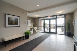 BRIGHT & SPACIOUS PENTHOUSE - PRIVATE WEST EXPOSED COVERED BALCONY OVERLOOKING BEAUTIFUL TREED GREENSPACE & CREEK. 2 bedroom, 2 bathroom, 2 parking spaces, in-suite laundry/storage rm. New Flooring & Paint. Vaulted ceilings & ideal split-bedrm layout—perfect for roommates or office. Bedrms w/custom closet organizers - primary w/oversized shower ensuite, main bathrm w/soaker tub/shower. Large windows flood home w/afternoon light & sunset views. Balcony w/gas BBQ hookup(BBQ included)—ideal for year-round living. Granite & SS kitchen, gas range & breakfast bar peninsula open to living & dining. Bike room, pet-friendly building w/no size restriction. Incredible location - walk to everything - future SkyTrain, rec centres, nature trails, parks, transit at your door step. RARE FIND - A MUST SEE!