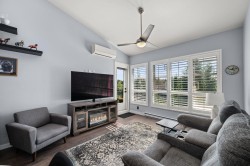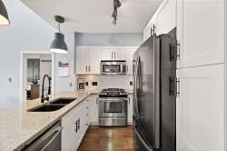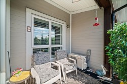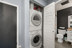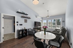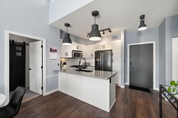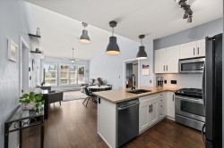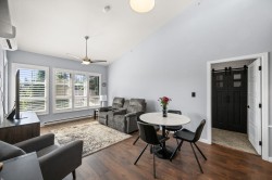 TOP FLOOR, VAULTED CEILINGS! Beautifully bright and sunny south exposure! Downsizer alert! This is the unit that you've been waiting for! Downsize in safety and comfort in this 2BDRM 2 BATH condo, with one occupant needing to be 55+ in age. Up to 13'ft vaulted ceilings! White kitchen cabinetry, S/S appliance package incl gas stove, granite counters. Heated ensuite tile floor in the master bath. 2nd Bdrm with cheater ensuite/main bath. Updated laminate floors and newer carpet in bdrm’s. California shutters. Updated paint and lighting throughout. BONUS storage locker on the same floor and 2 side by side parking stalls. Secure bike storage, fitness room and clubhouse included!NEW Heatpump offering A/C!
