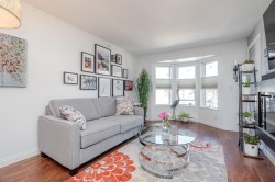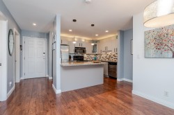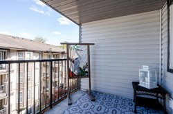 BETTER THAN NEW! This TOP FLOOR 2 beds/2 full bath unit offers 872sf of living space! As you enter you will feel the warmth of this home that has been tastefully updated. Starting with the kitchen that offers a good sized island, all new two toned cabinet doors/hardware, beautiful backsplash, granite counters, & S/S appliances. Main living is flooded w/natural light & features modern wall mounted fireplace + updated modern blinds. 2 good sized bedrooms (both w/new flooring) on opposite sides. Main bath beautifully updated w/new vanity, modern finishing/wallpaper & flooring. Ensuite updated w/ gorgeous new shower, counter, hardware, & flooring. In-suite laundry (updated washer/dryer) + storage room in unit. Great location close to schools, shopping, parks, amenities & future skytrain!