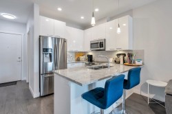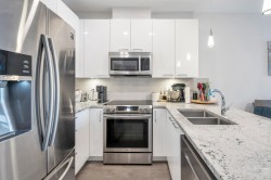 Brydon Green. Spacious 2 bedroom 2 bath top floor bright unit with oversized windows and 9' ceilings. Kitchen has Samsung S/S appliances incl microwave, European white lacquer cabinets, breakfast bar with granite countertops. Spacious primary bedroom with A/C. Ensuite has twin sinks & large walk-in shower. Large storage area and w/d. Centrally located and minutes away to schools, parks, Willowbrook Mall and transit plus future skytrain station, Great walking nature trails! The High quality laminate floors throughout. 2 pets allowed. 5 years remaining on building warranty. Low strata fees of $304.00. 1 parking (additional available). Top floor condo is vacant and ready for occupancy.