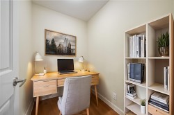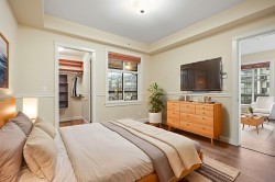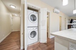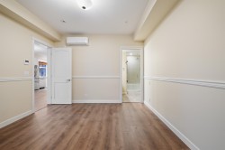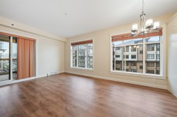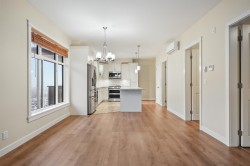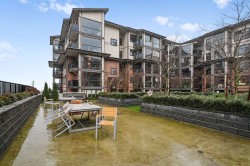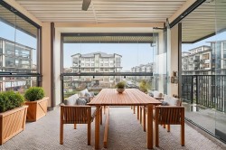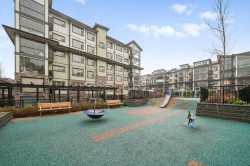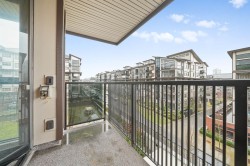 Welcome to Yorkson Park! 4th floor living in the heart of Willoughby Heights! This spacious 2 BED + DEN + 2 BATH home offers thoughtfully designed interiors with laminate flooring throughout, a cozy fireplace, A/C in every room, and a versatile den ideal for a home office. The south-facing glass-enclosed solarium is the standout feature, with retractable panels that flood the space with natural light all day and create seamless indoor/outdoor living, perfect for summer entertaining or a sheltered year-round retreat, complete with a natural gas BBQ hookup. Includes 2 parking stalls + a massive roll-up storage locker. Steps to Carvolth Exchange, Yorkson Park, restaurants, shops, and everyday services, comfort and convenience all in one! Open House: Sat Feb 7, 2–4PM.
