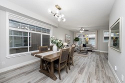 Welcome to Nature's Walk, an award-winning corner unit townhome in the heart of Willoughby! This bright and well-kept 3-bedroom home features newly updated flooring (2024) on the upper two levels, an open layout with extra windows for natural light, and a spacious kitchen with an oversized island, quartz countertops, stainless steel appliances, and maple shaker cabinets. Enjoy a sunny deck off the kitchen—perfect for BBQs or morning coffee. 3 bedrooms including a vaulted-ceiling primary with double closets and an ensuite featuring a large double shower. The tandem double garage provides extra storage and access to a fully fenced backyard. Pet-friendly complex, clubhouse, steps to Richard Bulpitt Elementary, parks, shops.