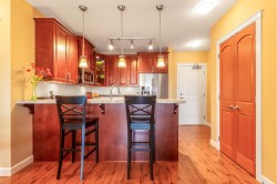This stunning Willoughby Heights home offers a thoughtfully designed 2-BED + DEN on the quiet side of the building with exceptional features. The open dining & living area flows from the elegant cherry wood kitchen to a RARE covered, east facing balcony with bifold glass doors, adding 211 SF of usable living space. The primary bedroom includes a linen closet, W/I closet with mirrored doors & a safe. Extras: gym, versatile den (office, nursery, studio), pantry with electrical (can be a 2nd office), ample storage, & 2 parking spots across from each other—one with private storage. Highly functional layout, premium finishings in a prime location. Don't miss out!