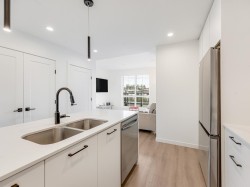 Welcome to the most popular location within the vibrant Latimer Village in Willoughby! This rarely available home with 9' height ceiling has a huge size (over 400 sf) deck for outside dining, viewing and entertaining. It boasts an open-concept floor plan, showcasing a contemporary kitchen equipped with full-sized stainless steel appliances, including a gas cooktop, and a generously sized island. One parking one storage locker. Central location: close to Highway 1 and Costco, Walmart, Willowbrook Mall and Willoughby Town Centre.